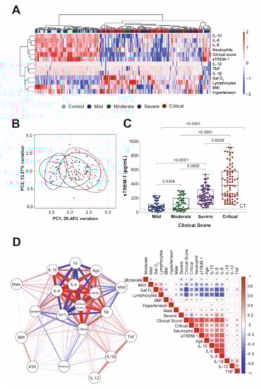 sTREM-1 levels were correlated with inflammatory cytokine production, comorbidities, and clinical severity of COVID-19 patients. (A) Unsupervised hierarchical cluster heat map showing the expression of markers and clinical parameters (Sat O2, lymphocytes (Ly), neutrophil (NE) counts, BMI, hypertension (ASH), sTREM-1, IL-1β, IL-6, IL-8, IL-10, IL-12, and TNF levels) for different groups of patients, according to the disease score (control, mild, moderate, severe, and critical) data are colored by row normalized value for each sample. (B) The PCA graphic shows the clusterization of those subgroups of patients (95% confidence interval), including all markers exhibited in the heat map, except for the levels of sTREM-1, performed with the base R functions. The continuous variables were transformed to log2 scale, and in the case of the heat map and PCA, the data used were transformed to z-scores (centered and scaled). (C) Levels of sTREM-1 in patients with different severity forms of COVID-19: mild (n = 44), moderate (n = 45), severe (n = 72), and critical (n = 76), as well as control (CT line, n = 50). Median values are presented with ranges. The Kruskal–Wallis test was used for multiple comparisons in data with non-normal distribution. The differences between each group are indicated by the p-value in the graphic above the diagram. (D) The color scale sidebar indicates the correlation coefficients (r), where red represents positive correlation, and blue represents negative correlation. The square size and color intensity are proportional to the correlation coefficients, p values were represented by * <0.05, ** <0.01, and *** <0.001. A network-based on Spearman’s correlation (p < 0.05) was constructed, analyzed, and graphically represented using the R packages.