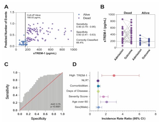 sTREM-1 levels in hospitalized patients with COVID-19 predicted mortality. (A) Adjusted predicted number of events for sTREM-1 levels. (B) Plasmatic levels of sTREM-1 of severe/critical patients were indicated for each individual on the day of hospital admission and after the outcome (dead or alive). The Mann–Whitney test was used for analyzing data with non-normal distribution, and differences between groups were established. (C) ROC and AUC assessing the discrimination capacity of sTREM-1 levels for mortality in hospitalized patients with COVID-19. (D) High levels of sTREM-1 and adjusted incidence rate ratio for the predictive variable of deaths. * Neutrophil/lymphocyte ratio (NLR).