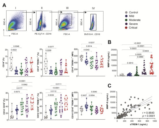 sTREM-1 was released from the surface of the peripheral blood leukocyte membrane, correlated with the expressionof MMP-8. (A) Sequential gating is shown: (I) SSC-A versus FSC-A; (II) leukocytes gated according to their side scatter and CD14 antibody staining patterns; (III) light scatter flow cytometry profile for cells based on forward scatter (FSC-A) related to size, and side scatters (SSC-A) related to granularity; (IV) gated according to their side scatter and CD16 antibody staining patterns. The percentage of CD14+ and CD14− CD16+ cells was evaluated for groups of COVID-19 patients, as well as the percentage of CD14+TREM-1+ and CD14−CD16+TREM-1+ in the cell surface. The amount of TREM-1 expression was obtained by quantification of MFI in CD14+ and CD14−CD16+ leukocytes. (B) MMP-8 quantification in subgroups of COVID-19 patients. Median values are presented with ranges. The Kruskal–Wallis test was used for multiple comparisons in data with non-normal distribution. Differences between groups are indicated by the p-values in the graphics. (C) Spearman test correlation between MMP-8 and sTREM-1 levels. The correlation coefficients (r) and the p-value are indicated in the graphic.