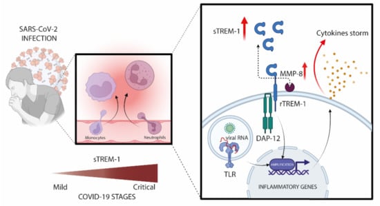 Our results suggest that plasma sTREM-1 levels at hospital admission can be used satisfactorily for evaluating disease severity and predicting adverse outcomes in patients with COVID-19. We suggest the potential role of sTREM-1 in determining the clinical course of COVID-19 and their correlation with other pro-inflammatory parameters. Furthermore, we propose a mechanism for the release of sTREM-1 established by MMP-8 activity on the surface of blood leukocytes. In this way, sTREM-1 has emerged as a potential prognostic biomarker that can be easily detected in plasma samples of COVID-19 patients.