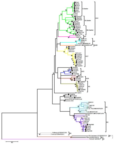 Maximum-likelihood phylogenetic tree based on alignment of the fragment of env gene. Sequences from this study are labeled by black circles and their names are proceeded by the flock origin and the animal species (s-sheep; g-goat). Subtypes are marked using different colors. Numbers at the branches indicate the percentage of bootstrap values obtained from 1000 replicates. Bootstrap values >70% are shown.