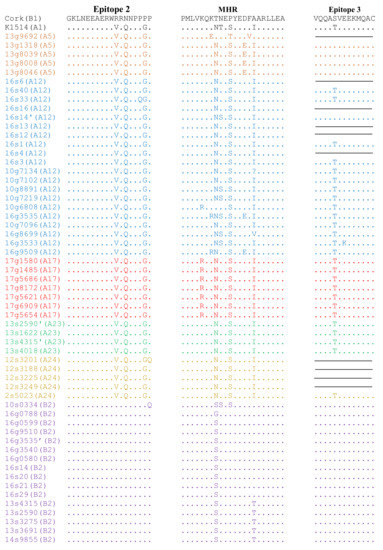 To analyze the conservation of immunodominant regions of sequences of Polish strains analyzed in this study, their deduced amino acid (aa) sequences of capsid and surface proteins were aligned with the aa sequences of reference parental strains, Cork and K1514. Pairwise percent identity of the gag amino acid sequences of Polish SRLVs was high and ranged from 81.3% to 100%. Furthermore, Polish sequences shared 82.1–96.3% and 92.4–97.7% amino acid sequence identity with strains Cork and K1514, respectively. Analysis revealed that all gag sequences belonging to group B had glycine-glycine (GG) motifs and all MVV-like sequences had asparagine-valine (NV) motif, typical for strains belonging to group A (Supplementary Materials Figure S3). Immunodominant epitope 3, situated at the C-terminal end of the capsid protein, was highly conserved between sequences belonging to group A and B, while the analysis of sequences in epitope 2 revealed a perfectly conserved region (GKLNEEAERW) located at the N-terminal part of epitope and distinct region at the C-part of the epitope specific for MVV-like (VRQNPPGP) and CAEV-like (RRNNPPPP) strains. In the Major Homology Region (MHR), which is usually highly conserved in the gag gene of all retroviruses, some alterations were present within group A (Figure 4). In particular, sequence from goat #9692 had isoleucine (I) instead of valine (V) at the fourth position compared to strain #K1514, while sequences from goat #6808 and #8699 had threonine (T) instead of asparagine (N), and valine (V) instead of isoleucine (I) at the eighth and 16th positions, respectively. All sequences representing subtype A17 and sequence from goat #6808 representing subtype A12 had substitutions arginine (R) instead of lysine (K) at the fifth position, while sequences from goat #3535 and #9509, representing subtype A12, had substitution arginine (R) instead of lysine (K) in the seventh position of MHR. All goat-derived sequences representing subtype A5 and sequences from goats #3535 and #9509 had substitution glutamic acid (E) instead of aspartic acid (D) at the 14th position. Six sequences had substitution serine (S) instead of threonine (T) and 35 sequences had substitution asparagine (N) instead of threonine (T) at the ninth position compared to the sequences of strain #K1514. Type B sequences had more conservative MHR sequences. Compared to sequences of strain Cork, all sequences had substitution at the eighth position (T/S or T/G). Sequences from sheep #0334 had substitution serine (S) instead of asparagine (N) and serine (S) instead of proline (P) at the ninth and eleventh positions. Five sequences representing subtype B2 which formed subclusters on the phylogenetic tree had unique substitution threonine (T) instead of alanine (A) at the 16th position of MHR.