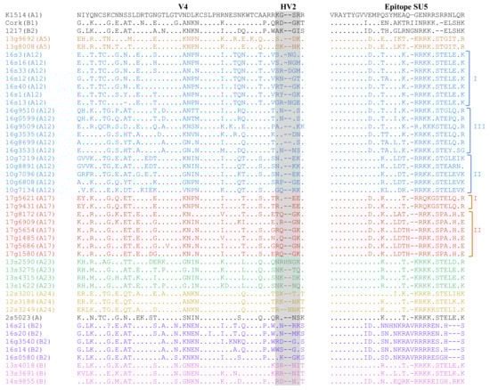 The env aa sequences of Polish strains were more heterogenous than gag sequences showing 54.1–100% similarity to each other and 57.1–73.1% and 59.4–73.7% to the strains K1514 and Cork, respectively. Sequences of the variable region (V4) of analyzed strains differed significantly. Comparison of aa sequences in epitope SU5 revealed the conserved region (VRAYTYGV) located at the N-terminal part of the epitope. The variable region was conserved among the sequences of strains belonging to subtypes A5, A23, A24, and B2 showing type-specific variation. Sequences belonging to subtypes A12 and A17 showed intra-subtype variability (Figure 5). Sequences could be divided into groups corresponding groups formed on the phylogenetic tree.