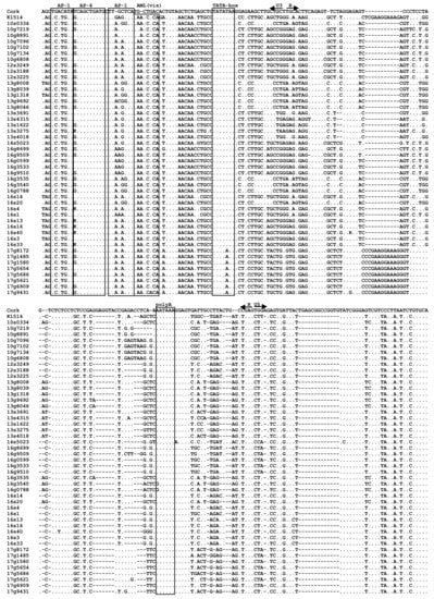 LTR sequences from 47 out of 54 samples (87%), which were successfully amplified, were aligned with sequences of prototype strains K1514 and CAEV-Cork representative for SRLVs groups A and B, respectively. The nucleotide pairwise percent identity of Polish sequences ranged from 72.3% to 100%. Furthermore, Polish sequences shared 48.4–53.8% and 74.0–85.8% sequence identity with strains Cork and K1514, respectively. The LTR regions analyzed in this study contained two AP-1, one AML (vis) and one AP-4 putative motifs without any duplication or deletion in their U3 regions compared with reference sequences (Figure 6). Sequences corresponding to the TATA box, AP-4, and polyadenylation signal (poly A) were quite conserved. All sequences belonging to subtype A17 had unique substitution T to A in the fifth position of TATA box. Sequence of AML(vis) motif was present in all Polish samples and was identical with the sequence of K1514 strain, except for sequences originating from goats #8891 and #7219 which had substitution A to G in the second position of AML-vis. The AP-1 sites were less conserved. Sequences of the first AP-1 site were identical in all Polish sequences analyzed and the sequence of K1514 strain (TCATGTA), but differed from the sequence of Cork strain (TGACATA), while in the second AP-1 site considerable nucleotide changes were observed. All Polish sequences analyzed, except sequences representing subtype A17, had the specific 11 nt deletion in the R region. However, A17 sequences had the CCGAAGGAAAG insertion almost identical, like in the K1514 strain. Furthermore, all Polish sequences had 13 nt deletion in the U5 region.