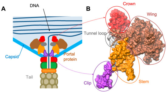 - Corynne, L.D.; Cingolani, G.; Teschke, C.M. Portal Protein: The Orchestrator of Capsid Assembly for the dsDNA Tailed Bacteriophages and Herpesviruses. Ann. Rev. Virol. 2019, 6, 141–160. [Google Scholar]