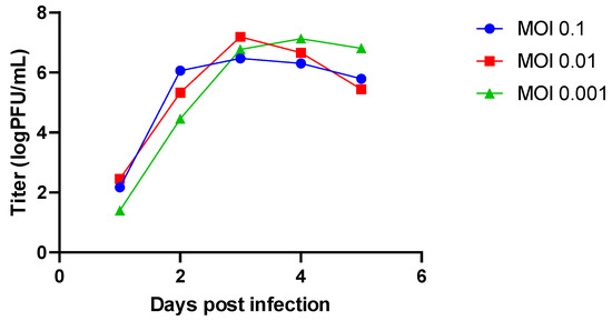 Vero or A549 cells were seeded in T-flasks (25 cm2) at a concentration of 1.1 × 106 cells in 12 mL of MEM containing 10% FBS or DMEM containing 10% FBS, respectively, and grown overnight. The next day, cell layers were washed twice with phosphate-buffered saline (PBS) and cells were infected at the multiplicity of infection (MOI) indicated in the Results section. After 1 h of adsorption, the virus was removed, cells were washed twice with PBS, and medium containing 2% FBS was added. Cells were further incubated at 35 °C. From day 1 to day 6 after infection, an aliquot was taken from each flask, and stored at −60 °C or below until viral titre was determined.