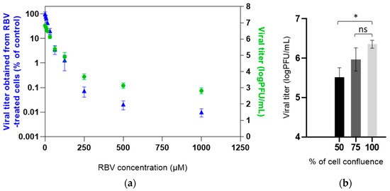 Dose-dependent antiviral effect of RBV against MuVi-C: (a) Vero cells were treated with different concentrations of RBV or mock-treated, infected with MuVi-C at MOI 0.001. Then, media with or without RBV were added for an additional 72 h. Titres in supernatants were determined using the plaque assay; titres (logPFU/mL) are plotted on the right y axis, and the titre (number of plaques) of virus obtained from RBV-treated cells as a percentage of the virus titre obtained from untreated, control cells is given on the left y axis. (b) Vero cells were seeded to obtain 50%, 75% and 100% confluence on the day of infection, infected with MuVi-C at MOI 0.001. Supernatants were collected after 72 h and titres in supernatants were determined using the plaque assay. Mean and standard deviations are shown from 3 biological replicates. Statistical significance between groups was determined using Kruskal–Wallis one-way ANOVA (* p < 0.05; ns, nonsignificant).