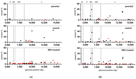 Variant frequency (%) in parental and RBV-treated (250 µM) or control MuVi-C and ZgA/Cro69 viruses from the first passage in Vero and A549 cells, respectively, according to their location in the genome: (a) MuVi-C and (b) ZgA/Cro69. Corresponding genes are given at the top of the diagrams. RBV-specific mutations (G-to-A and C-to-U) are shown by red dots and all other mutation types by black dots. Only variants present at >1% are shown.