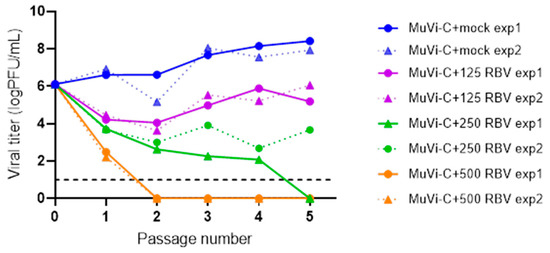 Passaging of MuVi-C in Vero cells treated with different concentrations of RBV. Vero cells were treated with different concentrations of RBV or mock-treated, infected with MuVi-C at MOI 0.001, and then, RBV or medium only were added for an additional 72 h. Titres in supernatants were determined using the plaque assay, and they were further used for subsequent passage at MOI 0.001 in the same conditions. A cutoff value of the plaque assay is shown by a black, dashed line.