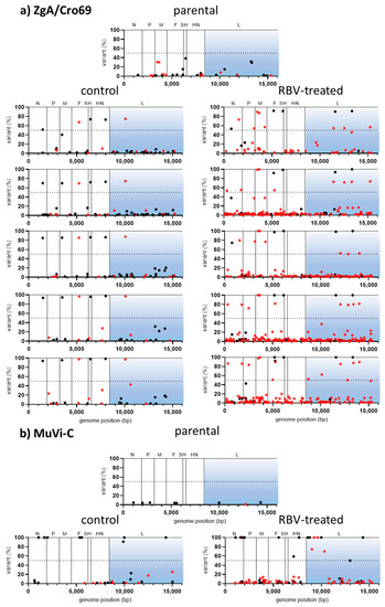Variant frequency (%) in parental and RBV-treated (62.5 µM) or control (a) ZgA/Cro69 and (b) MuVi-C viruses from different passages in A549 and Vero cells, respectively, according to their location in the genome. RBV-specific mutations (C-to-U and G-to-A) are shown by red dots and all other mutation types by black dots. Dashed lines indicate a value of 50%; changes present in values higher than 50% are consensus changes. The L gene, where resistance-/fidelity-related mutation/s are expected to emerge, is given in blue. Only variants present in >1% are shown.