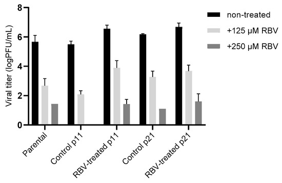 Resistance of passaged RBV-treated and control ZgA/Cro69 viruses to RBV. Parental, control, and RBV-treated viruses from passages 11 and 21 in A549 cells were tested for sensitivity to 125 or 250 µM RBV in A549 cells. Titres in supernatants were determined using the plaque assay. Mean ± standard deviation obtained from 3 biological replicates are shown. Statistical significance between groups was determined using Kruskal–Wallis one-way ANOVA. There were no significant differences between different samples treated with the same RBV concentration.