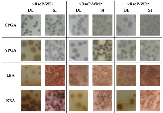 Morphology of vRsoP-WF2, vRsoP-WM2 and vRsoP-WR2 plaques. The phages produced clear plaques surrounded by translucent halos after prolonged incubation with strain CFBP 4944 of R. solanacearum in CPGA, YPGA, LBA and KBA culture media. Clear plaques due to lytic activity were observed after 24 h at 28 °C and the translucent halos around the lytic plaques were increasing in size within time after 2–3 days at 28 °C, and 7 days at 4 °C in double layer (DL) and surface inoculation (SI) methods.