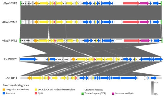 These European phages showed high homology and shared similar genomic organization with some closely related R. solanacearum or Ralstonia sp. phages, RsoP1EGY, DU RP I, P-PSG-11 and P-PSG-11-1 [46,47]. In fact, vRsoP-WR2 shared with RsoP1EGY a large insertion of similar size [47]. However, it should be noted that, despite the fact that at sequence level the African RsoP1EGY phage exhibited greater homology with the European phages, the genomic organization was more similar to that of the Asian phage DU_RP_I.