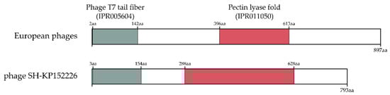 An exopolysaccharide depolymerase was also identified in the ORFs coding for a tail fiber protein (ORF 48 in vRsoP-WF2 and vRsoP-WM2, and ORF 49 in vRsoP-WR2) in the three European viruses. Bioinformatic analysis of these ORFs showed that they encode for proteins with two conserved domains, a N-terminal T7-like tail fiber domain (IPR005604) and a central domain with a pectin lyase fold structure (IPR011050) (Figure 4). These two domains have a structure equivalent to that of the ORF 42 of the phage SH-KP152226 of Klebsiella pneumoniae [69], which conserved the amino acid (aa) sequence of the N-terminal domain (residues 2~142) and the central region with a domain (residues 396~613) identified with pectin lyase activity (IPR011050). No conserved domains were found in the C-terminal region (Figure 4). These ORFs exhibited high identity with the closest Ralstonia phages RsoP1EGY (99%), DU_RP_I (98%) and P-PSG-11 (97.77%), although RsoP1EGY and DU_RP_I have 85 fewer residues in the N-terminal region than the three European phages, while the size matches in the case of phage P-PSG-11.