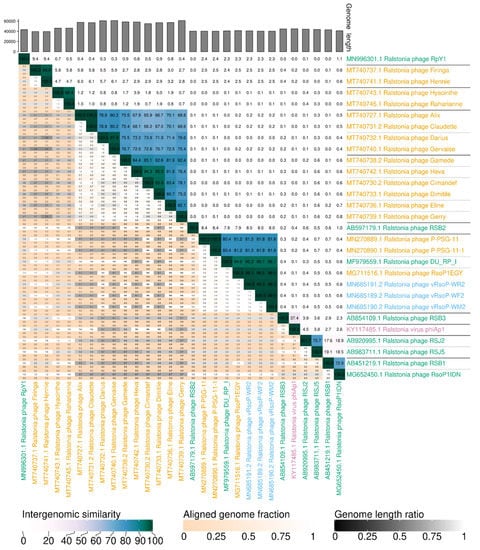 - Moraru, C.; Varsani, A.; Kropinski, A.M. VIRIDIC-A novel tool to calculate the intergenomic similarities of prokaryote-infecting viruses. Viruses 2020, 12, 1268. [Google Scholar] [CrossRef] [PubMed]