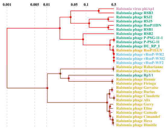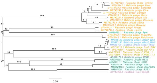 Phylogenetic analysis was performed with the whole genomes of the three river water European phages and a selection of their 26 closest viruses belonging to the Autographiviridae family (formerly Podoviridae) able to infect either R. solanacearum (three African phages [46,47], one American [48] and one Asian (accession number: MF979559) or the closely related species R. pseudosolanacearum (21 phages from diseased plants, soil or irrigation water isolated from Africa (14) [49] and Asia (7) [50,51,52]).