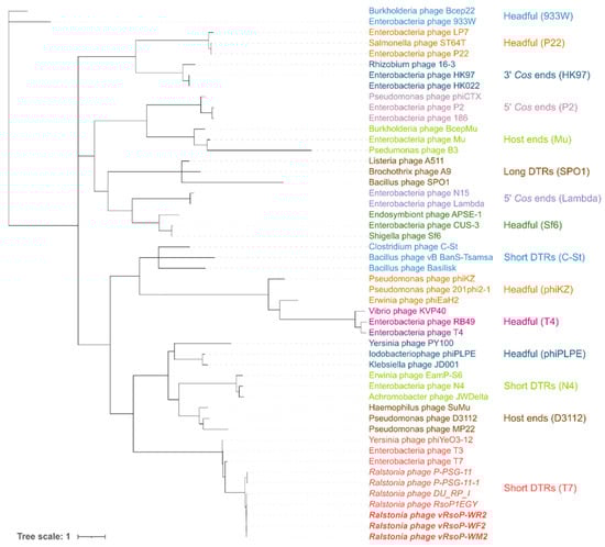 The nucleotide and protein sequences of the three European water phages were used to classify the phages. Phylogenetic analysis of the whole genomes of these three water phages and a selection of their 26 closest Autographiviridae (formerly Podoviridae) viruses infecting R. solanacearum and/or the closely related species R. pseudosolanacearum using VIRIDIC, allowed the classification of the 29 analysed phages into 20 species and 11 genera (Figure 5). The phylogenetic tree based on genomic distances of phages using VICTOR showed two clusters (Figure 6). In the upper cluster, all the African phages of R. pseudosolanacearum from plant, soil and water samples from Mauritius and Reunion islands [49] and the Asian phage RpY1 from Korean soil [52] were grouped. In the lower cluster were most of the Asian R. pseudosolanacearum phages and the only R. solanacearum American phage from Brazilian soil; in a subcluster were the three European R. solanacearum water phages (intergenomic similarity > 99%) together with the Egyptian R. solanacearum soil RsoP1EGY phage (intergenomic similarity ranging from 99 to 98.5%, depending on the phage), and more distant phages were located the Asian Ralstonia sp. DU_RP_I phage (intergenomic similarity about 95%), the African PSG-11 phage (intergenomic similarity >80%), and its heat adapted PSG-11-1 phage, isolated from water sources in Kenya [46]. Thus, VIRIDIC and VICTOR grouped vRsoP-WF2, vRsoP-WM2 and vRsoP-WR2 into the same new species, together with the phage RsoP1EGY (MG711516.1), isolated in Egypt more than a decade after the three European phages, whose activity against R. solanacearum was patented in 2017 because of their novelty and biocontrol efficiency [24]. This novel species shared the genus with phages DU_RP_I (MF979559.1), P-PSG-11 (MN270889.1) and P-PSG-11-1 (MN270890.1) (Figure 6). The phylogenetic analysis based on the viral proteomic tree using ViPTree (Figure 7) yielded a similar tree to that obtained using VICTOR, hence providing additional support to taxonomic results with VICTOR and VIRIDIC. Thus, the three phages belong to the same novel species that was further classified within the genus Gyeongsanvirus of the Autographiviridae family (Figure 5, Figure 6 and Figure 7). In order to determine the DNA packaging mechanism of the three European R. solanacearum phages, a phylogenetic tree was generated for the terL gene encoding for the large terminase subunit. The results revealed that the three phages clustered with each other and with the most closely related phages, which also supports the results of the phylogenetic analysis with the complete genomes (Figure 8). In addition, vRsoP-WF2, vRsoP-WM2 and vRsoP-WR2 clustered with T7-like phages, which use a packaging mechanism belonging to short DTR (Figure 8). Phage termini were sequenced by primer walking, allowing us to identify DTRs.