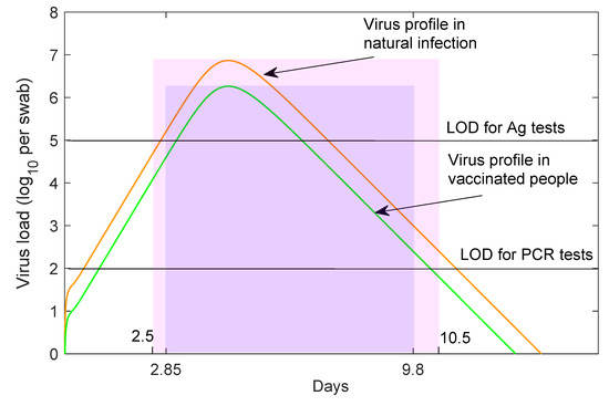 Virus profiles in non-vaccinated and vaccinated individuals. virus load per swab over time during Alpha variant natural infection (red line) and vaccination (green line) as given by the within-host model in [29]. Non-vaccinated patients are assumed to be infectious from days till days (shaded pink region). Vaccinated patients are assumed to be infectious from days till days (shaded purple region). Black horizontal lines correspond to RT-PCR test detection threshold (LOD) of per swab and antigen test detection threshold (LOD) of per swab.