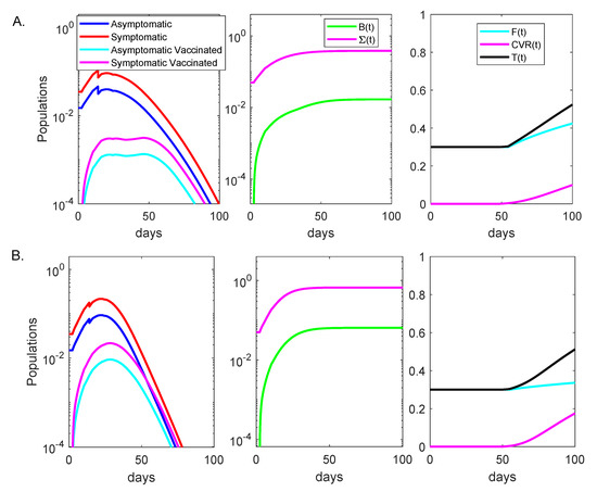 To simulate an initially undetected outbreak in a partially vaccinated population, we assumed that at time , when a total of of individuals have been fully vaccinated, of the population was infected with the Alpha variant, with symptomatic and with asymptomatic disease. The vaccine efficacy was given by (11), additional vaccines were administered daily starting with day , and no testing was considered. Daily symptomatic, asymptomatic, breakthrough asymptomatic and breakthrough symptomatic cases peaked at , , and of the entire population at days 14, 14, 47 and 47, respectively (see Figure 2A, left panel, red, blue, magenta and cyan lines). At day 100, a cumulative of the population had been infected when not fully vaccinated (see Figure 2A, middle panel, magenta line) and a cumulative of the population had been infected while fully vaccinated (see Figure 2A, middle panel, green line). Lastly, at day 100 a cumulative of the naive population has been fully vaccinated (see Figure 2A, right panel, cyan line), a cumulative of the population had been fully vaccinated after recovering from natural infection (see Figure 2A, right panel, magenta line), and a cumulative of the population had been vaccinated (see Figure 2, right panel, black line). A quantity of interest is the percent breakthrough number, , defined as the percent of cumulative naive fully vaccinated individuals who get infected divided by the cumulative fully vaccinated population. In this case, we obtained a percent breakthrough case rate at day 100.