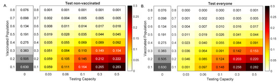 For low vaccinated population, increased testing resulted in increased reduction in cumulative cases, regardless of the testing strategy. In particular, for vaccinated population and no testing, the outbreak resulted in infections by day 100 (see Figure 4, grey heatmaps). When testing only non-vaccinated individuals, this number was reduced by , and percentage points for , and , respectively (see Figure 4A, colored heatmaps). When testing everyone, this number was reduced by , and percentage points for , and , respectively (see Figure 4B, colored heatmaps).
