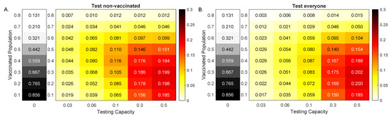 Note that, for both testing scenarios, the amount of reduction decreased with the increase of (for a fixed ) and increased with the increase of testing capacity C (for a fixed ). Moreover, the highest decrease happened for the highest testing in the least vaccinated population. Lastly, in all cases, the model predicted that testing only non-vaccinated results in improved outcomes.