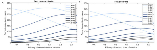 We next investigated the effect of testing in reducing infectious cases when the vaccine efficacy decreased. We fixed the background vaccination level to and determined the percent case reduction for different values when the efficacy of the second dose varied between and (see Figure 7). For values for which , the effect of testing decreased with increasing vaccine efficacy. For values for which , the effect of testing increased as vaccine efficacy increased. For , testing had maximum effect for variants with close to 1 (), regardless of testing strategy (see Figure 7A,B), and testing non-vaccinated individuals alone only marginally improved the outcomes.