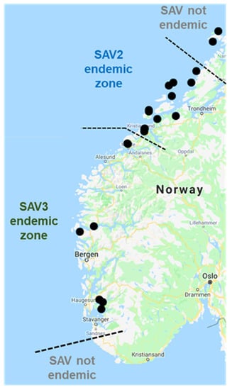 PD has been present in Norway since the 1980s and is thought to have been exclusively caused by SAV3 until SAV2 was detected during an outbreak in 2010 [,]. SAV2 was likely initially transmitted to mid-Norway from Scotland, where SAV2 is a common PD-causing subtype []. This may have occurred via industry well boat activity, though transmission from wild reservoir species cannot yet be ruled out []. SAV2 and SAV3 are defined as separate endemics in Norway, tolerated in largely non-overlapping regions within a wider endemic PD zone, stretching from the southern end of Norway to Flatanger in Trøndelag [] (Figure 1). Detection of PD outside the endemic zone triggers immediate disease control actions []. Within the endemic zone, SAV3 is predominantly detected in Hordaland and Rogaland, while SAV2 dominates in Møre og Romsdal and Trøndelag []. With the aim of restricting the spread of SAV2 and SAV3, the endemic PD zone is currently split at Hustadvika (Møre og Romsdal), with SAV2 and SAV3 tolerated above and below this boundary, respectively []. SAV2 has recently been detected outside the endemic PD zone and within the SAV3 endemic zone [], but the origin of these outbreaks is unestablished.