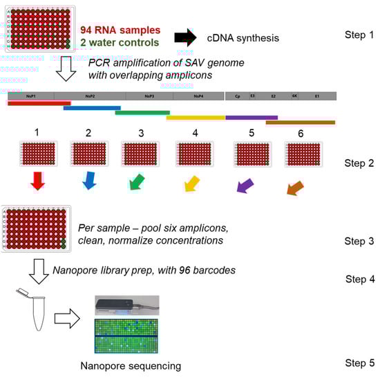 Visualization of steps used in this study generate nanopore sequencing data spanning the SAV genome. See Methods (Section 2.1, Section 2.2 and Section 2.3) for full details.