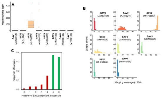 Summary statistics for SAV nanopore sequencing data. (A) Boxplot depicting mapping depth across the reference genomes for the seven SAV subtypes (n = 94 samples). Mapping depth represents the number of times the base pairs in the SAV genome are covered by the mapped nanopore reads. (B) Frequency histogram depicting the number of samples showing genome-wide coverage against the same reference genomes (bin-widths of 5%). Coverage represents the proportion of base pairs in the reference genome covered by mapped nanopore reads. (C). Histogram showing the number of successful amplicons generated (out of 6) as a proportion of n = 94 samples.