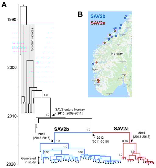Consistent with a recent study [], all Norwegian SAV2 sequences were monophyletic and descended from Scottish SAV2 sequences (Figure 4A; Figure S2). According to the Bayesian tree (Figure 4A), which employed a relaxed uncorrelated molecular clock model [] assuming constant viral population size, the most recent common ancestor (MRCA) of Norwegian SAV2 existed during 2010 (95% HPD: 2009–2011). This estimate is consistent with the first time that SAV2 was detected in 2010 []. SAV2 then split off into two major lineages around 2013 (95% HPD: 2011–2016), hereafter named SAV2a and 2b (Figure 4A). The MRCA of the sampled SAV2a and 2b lineages existed in 2016 (respective 95% HPDs: 2013–2018 and 2013–2017) (Figure 4A).