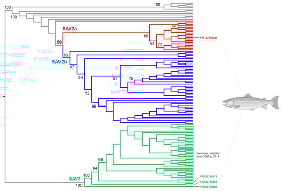 Phylogenetic analyses were performed on two separate alignments. The first included SAV2 genomes, with the aim to reconstruct the genetic diversity and spatial-temporal transmission dynamics of SAV2. The second included SAV2 and SAV3 genomes, with the aim to elucidate the phylogenetic position of novel SAV3 genomes discovered during the study. For the SAV2 alignment, 68 SAV2 sequences generated by ONT sequencing (Table S1) were aligned along with 13 additional SAV2 genomes (Table S2) (four generated in this study by Sanger sequencing; Section 2.6) using Mafft v.7 [,] with default settings. For the SAV2 and SAV3 alignment, the same SAV2 sequences were aligned along with 42 SAV3 genomes, including 3 SAV3 genomes generated here by ONT sequencing (Table S1), and 39 further SAV3 genomes (Table S3), using the same approach. Sequence alignments for the SAV2 (81 sequences, 11,684 sites) and SAV2 + SAV3 analyses (123 sequences, 11,684 sites) are provided as Supplementary Datasets S1 and S2.