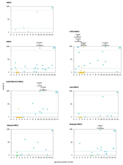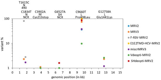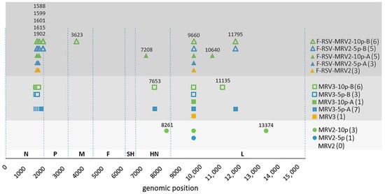 The lowest number of heterogeneous genomic positions was found in MRV2 populations, while the diversities of MRV3 and F–RSV-MRV2 were comparable (