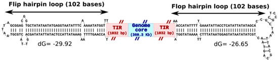 Sequence structures at the ends of the KV-LCC10 chromosome. Schematic representation of the linear KV-LCC10 genome with covalently closed, incompletely base-paired hairpin termini flanked by TIRs. The 102 bp hairpin sequences and TIRs on each side of the genome are inverted and complementary. The minimum free energy (dG) fold of the two versions of the hairpin loop (flip/flop) was inferred using the MFOLD program. Please note that the positioning of the flip/flop versions relative to the left/right sides of the genome could not be determined using the current data and is therefore represented here arbitrarily.