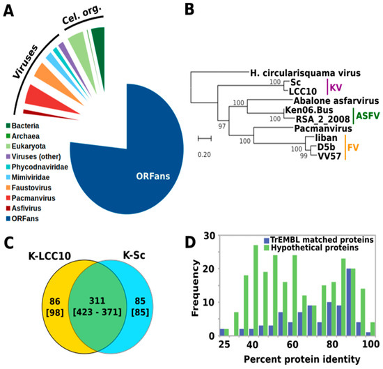 Comparative genomics of KV-LCC10. (A) Taxonomic classification of the KV-LCC10 protein best matches in the TrEMBL database. Best matches were identified with MMSEQS and a E-value threshold of 1E-05. Match to KV-Sc proteins were not included. (B) Phylogenetic tree of the DNA polymerase proteins. The multiple alignment was done with MAFFT and the phylogenetic tree was reconstructed with FastTree using default parameters. Branch supports indicated beside internal nodes were obtained using the SH-aLRT method as implemented in FastTree. The scale bar indicates the number of substitutions per amino acid sites. (C) Protein families shared between the two KVs strains. Numbers outside and inside brackets indicate the number of protein families involved in the category and the cumulative number of proteins in those families, respectively. For families shared between K-LCC10 and K-Sc, 423 is the number of proteins for K-LCC10 and 371 is the number of proteins for K-Sc. (D) Protein sequence similarity between reciprocal best matches between the two KV strains. The blue distribution represents proteins that have a significant match in the TrEMBL database (with exclusion of KV entries); the green distribution represents proteins with no significant matches in TrEMBL and therefore considered as hypothetical proteins.