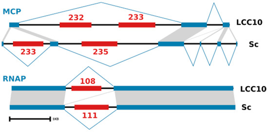 Type-1 introns in KV genes. Schematic representation of the MCP and RNAP genes in the two KV strains (KV-LCC10 above, KV-Sc below). Exons are represented by blue rectangles connected by blue lines showing splicing sites. Nucleotide sequence similarity is indicated by grey shaded areas. Homing endonuclease ORFs are shown by red rectangles, with numbers referring to the gene locus id in the respective Genbank records.