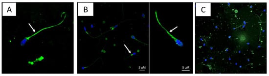 Immunofluorescent patterns. Slides with IF-positive (green) re-examined with confocal microscopy. Figures in this panels shows that Flavivirus antigens (green, Alexa 488) binds to sperm cells, with high affinity to the tail (A,B) and the neck (B) of the sperm, as pointed out by white arrows. Green spots were also observed in the head of some sperms as shown in C (center). Pictures were captured using confocal microscopy (LSM700 Zeiss, Oberkochen, Germany). All images were taken with 63× objective.