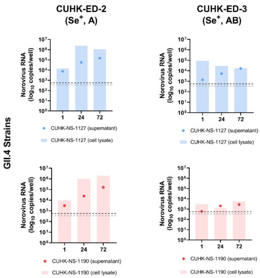 Replication of two Human norovirus (HuNoV) GII.4 Sydney [P31] strains in human intestinal enteroids (HIE) lines CUHK-ED-2 and CUHK-ED-3: The monolayer of each human intestinal enteroids lines was inoculated at a multiplicity of infection of 50 (approximately 3.0 × 106–3.4 × 106 genome equivalents/well) with the two strains in two independent experiments (as biological replicates). Norovirus RNA was extracted from the supernatant and cell lysates collected at 1, 24 and 72 h post-inoculation (hpi). Viral RNA copies per well were obtained by a highly sensitive genogroup-specific quantitative reverse transcription polymerase chain reaction (RT-qPCR). The horizontal grey and silver dotted lines indicate the lower detection limit of RT-qPCR at 552 copies per well of supernatant and 342 copies per well of cell lysates, respectively. Se+, indicates secretor positive; A and AB, represent blood groups A and AB, respectively.