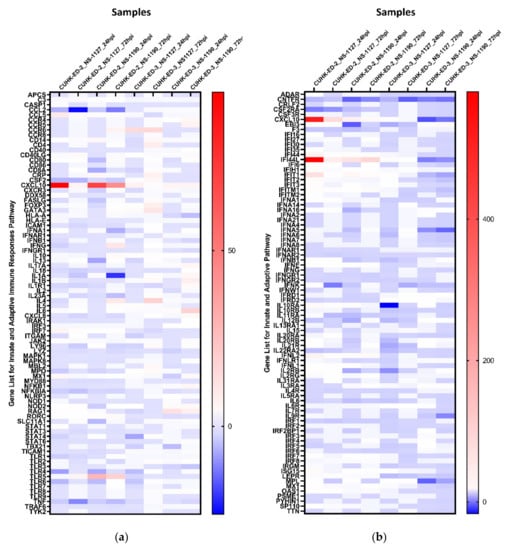 Heat maps showing the regulation of genes expression within each inoculation against 1 hpi of (a) the “Innate and Adaptive Immunity” pathway and (b) the “Human Interferon and Receptor” pathway: a gradient of blue to red was used to indicate the fold change obtained. Red colour illustrates an upregulation of the genes, whereas blue colour represents a downregulation of genes with reference to baseline samples at 1 hpi. All samples are associated with productive HuNoV replication except CUHK-ED-3 inoculated with CUHK-NS-1190.