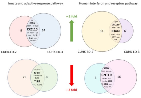 We aimed to utilize RT2 PCR arrays to profile elevated immune genes in HIE induced by HuNoV infection using the pandemic GII.4 Sydney [P31] variant. The RNA obtained from cell lysates of inoculated HIE lines was used for cDNA synthesis and gene expression profiling in the two selected immune-related pathways. Considering the three successful inoculations only, CXCL10 and TLR4 were the most up- and downregulated genes in at least one time point (24 and 72 hpi), respectively (Figure 3a) in the “Innate and Adaptive Immune Response” pathway. Upon HuNoV inoculation, a total of 23 and 28 genes were upregulated in CUHK-ED-2 and CUHK-ED-3, respectively. In particular, 14 genes were mutually upregulated in both CUHK-ED-2 and CUHK-ED-3. At the same time, a total of 38 and 15 genes were downregulated in CUHK-ED-2 and CUHK-ED-3, in which 9 genes were downregulated in both CUHK-ED-2 and CUHK-ED-3 (Figure 4). Among them, CXCL10 was the most upregulated gene (range of fold changes: 6.3–93.7). Upregulation of CXCL10 was most evident in HIE line CUHK-ED-2.