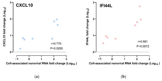Correlation of gene expression fold change and cell-associated norovirus RNA fold change: All data points were included, including those from CUHK-ED-3 inoculated with CUHK-NS-1190 that showed no productive HuNoV replication, for (a) CXCL10 and (b) IFI44L.