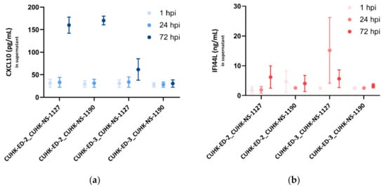 Secreted (a) CXCL10 (pg/mL) and (b) IFI44L (ng/mL) levels in enteroid lines at 1, 24 and 72 hpi as measured by ELISA: three independent experiments as technical replicates were performed using the supernatants infected with CUHK-NS-1127 and CUHK-NS-1190. Error bars denote standard error of the mean.