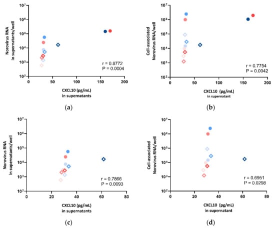 Correlation between norovirus RNA in (a) cell lysates, (b) supernatants, (c) cell lysates after dropping two outliers and (d) supernatants after dropping two outliers against CXCL10 concentration measured in supernatants, where the symbol shape indicates the enteroid line used: circles represent CUHK-ED-2, and hollow rhombuses represent CUHK-ED-3. The colour indicates the virus strain for inoculation: blue was used for CUHK-NS-1127 and pink was used for CUHK-NS-1190. The gradient of colour change illustrates the time of sampling: the lightest colour denotes 1 h post-inoculation (hpi), the colour in between denotes 24 hpi and the darkest colour indicates 72 hpi.