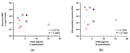 The IFI44L level in supernatant was also compared against norovirus RNA fold change in both supernatants and cell pellets. However, no correlation was observed (Figure 8), and thus, multivariate analysis was not performed.