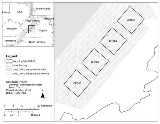 The 2012–2013 ONRAB field trial was conducted in West Virginia, USA (37 47′ N, 80 37′ W) as a continuation of a study initiated during 2011 [32]. Raccoon and striped skunk marking and sampling occurred within four 127 km2 cells established during 2011 that were separated by 5 km buffers and located to minimize edge effects around areas where target wildlife were sampled. Study cells were located in Monroe, Summers, and Greenbrier Counties and consisted mainly of forest and agriculture habitat (Figure 1). The ONRAB baits were distributed at 75/km2 with 750 m parallel flight lines or by ground means (hand distribution from vehicles) throughout this area similar to 2011 (see Slate et al. [32]). During the period 2014–2016, we reduced pre- and post-ORV sampling to three of the four original cells. Target bait density was quadrupled to 300/km2 and flight-line spacing was reduced to 250 m, similar to ORV strategies reported by Rosatte et al. [5].