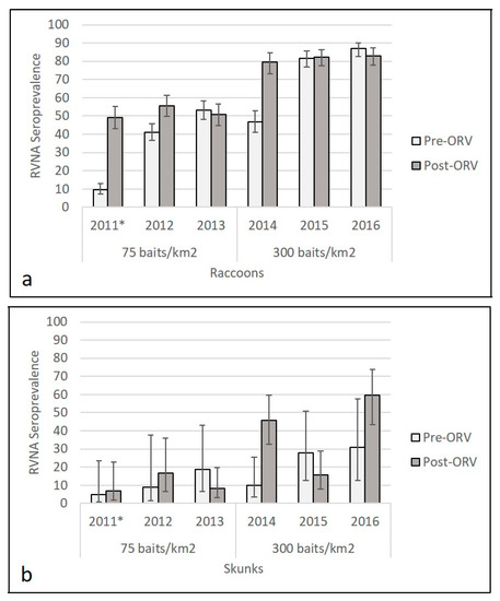 Raccoon (a) and skunk (b) rabies virus-neutralizing antibody (RVNA) seroprevalence from oral rabies vaccination (ORV) field trials with Ontario Rabies Vaccine Baits (ONRAB) in West Virginia, USA in relationship to bait density, sampling period (pre- or post-ORV), and year. RVNA cutoff observed was 0.125 IU/mL for the period 2012–2016. * Information from 2011 was from Slate et. al. [32] and included for comparison with years 2012–2016.
