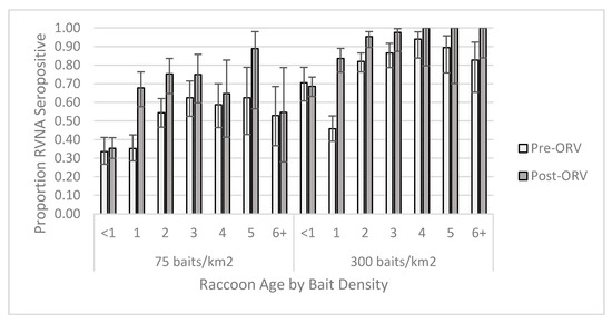 Proportion of raccoons seropositive for rabies virus-neutralizing antibodies (RVNA) at a cutoff of 0.125 IU/mL by year of age and bait densities sampled pre- and post-oral rabies vaccination (ORV) in West Virginia, USA. Error bars represent 95% confidence intervals.