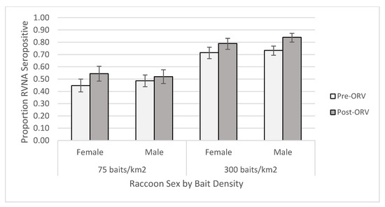 Proportion of raccoons seropositive for rabies virus-neutralizing antibodies (RVNA) at a cutoff of 0.125 IU/mL by sex and bait densities sampled pre- and post-oral rabies vaccination (ORV) in West Virginia, USA. Error bars represent 95% confidence intervals.