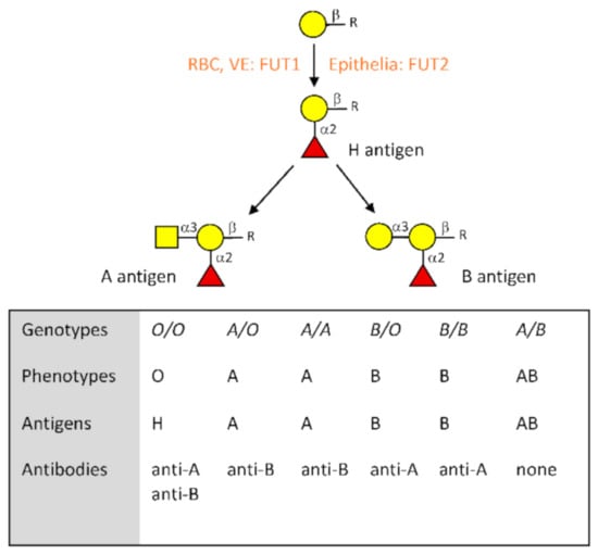 The ABO blood group system was discovered more than a century ago and its understanding allowed the development of blood transfusion. However, the corresponding antigens are expressed on a large number of cell types in addition to erythrocytes []. They are of the carbohydrate type, constituting terminal motifs of either N-linked or O-linked chains of glycoproteins as well as of glycolipids. Their synthesis proceeds by addition of monosaccharide units to precursor glycan chains through specific glycosyltransferases. It first requires the synthesis of the histo-blood group H precursor antigen, which is catalyzed by alpha1,2fucosyltransferases that add a fucose in α1,2 linkage to a terminal β-galactose of the subjacent glycan chain. The FUT1 enzymes are responsible for this activity in erythroblasts, megakaryocytes, vascular endothelial cells, and several other cell types, while it is the FUT2 enzyme that catalyzes synthesis of the H antigen in most epithelial cells such as the upper airways, the digestive tract, and the lower genito-urinary tracts. Once the H antigen is produced, addition in α1,3 linkage of an N-acetylgalactosamine or of a galactose to the same subjacent galactose unit by the A or B blood group enzymes generates the A and B antigens, respectively (Figure 1). The A and B enzymes are coded by distinct alleles of the ABO gene, whereas the O alleles correspond to null alleles unable to generate any active enzyme. These three major types of alleles generate the four major phenotypes O, A, B, and AB []. Both the FUT1 and FUT2 genes also present null alleles that lead to a lack of precursor H antigen synthesis in the corresponding cell types and therefore to a lack of A and B blood group antigens expression in these cells []. FUT1 null alleles are responsible for a rare red cell phenotype called “Bombay”. Given its rare occurrence, it will not be discussed any further. By contrast, null alleles of the FUT2 gene are common and their frequency varies across populations. These alleles are responsible for the so-called “nonsecretor” phenotype which by contrast with the “secretor” phenotype is characterized by a lack of A, B, and H antigens in many secretions such as saliva and in epithelia. In the Western world, the secretors represent around 80% of the population and nonsecretors, the remaining 20% [].