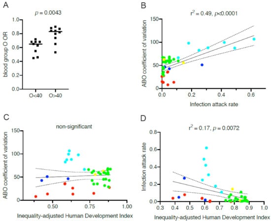 Relationship between ABO blood groups and the impact of COVID-19 across countries. (A) Blood group O odd ratios (ORs) of COVID-19 relative to the other blood groups and blood group O frequencies at various geographical locations. Odd ratios were obtained from the works in [,,,,,,,,,,,,], and the frequencies of blood group O were those reported in the groups of controls of the corresponding studies, representing frequencies in the local populations. OR values in populations where frequencies of blood group O are below and above 40% (O < 0.4 and O > 0.4, respectively) were compared by a two-tailed Mann–Whitney test. (B) Regression analysis between coefficient of variation calculated from the distribution of ABO for each country and attack rates represented by median estimates calculated by O’Driscoll et al. [] from seroprevalence studies. (C) Regression analysis between ABO coefficients of variation of each country and the 2018 IHDI (inequality-adjusted human development index) obtained from the UNDP (United Nation Development Program). (D) Regression analysis between COVID-19 attack rates of each country and the 2018 IHDI. Countries are labeled by geographic area. Cyan: Central and South Americas; blue: Africa; green: Europe; yellow: North America; red: Asia.