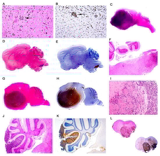 Primitive neuroectodermal tumors; location. Low magnification view of a JCPyV transgenic mouse brain demonstrating a small pocket of neoplastic cells (arrow) in the lower portion of the brainstem ((A) hematoxylin and eosin). T-Antigen immunolabeling highlights this small collection of neoplastic cells (100× magnification). (B). Full montage of a JCPyV transgenic mouse brain, demonstrating a large tumor, which substitutes the majority of the brain parenchyma (100× magnification). ((C) H & E). Consecutive full montages showing very small PNETs located in the brainstem ((D,E) H & E and T-Antigen respectively). At low magnification the small blue cell tumors in the medulla are evident (Panel F). These embryonal tumors can also reach large dimensions when located in the basal ganglia ((G,H) H & E and T-Antigen respectively). In very few cases the tumors originated in the olfactory bulb ((I) 100× magnification). Panels (J) and (K) depict the subarachnoid dissemination of these tumors in the cerebellum, typical of PNETs. Finally, very few cases de-veloped tumors in the spinal cord ((L) full montage, H & E and T-Antigen).